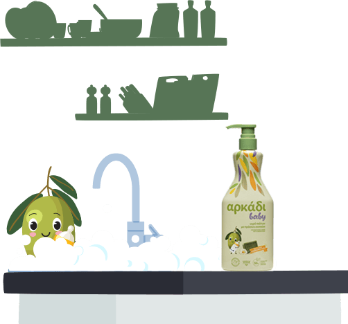 Ο μικρός Αρκαδούλης πήρε χαρά και δύναμη από αυτό που άκουσε και πήγε στην κουζίνα. Εκεί, έκανε τα μαγικά του για να γίνει αυτό που ξέρουμε ως το νέο Αρκάδι Baby Υγρό Πιάτων, που έχει ήπιους καθαριστικούς παράγοντες, πράσινο σαπούνι και βιολογικό εκχύλισμα ελληνικού χαμομηλιού.