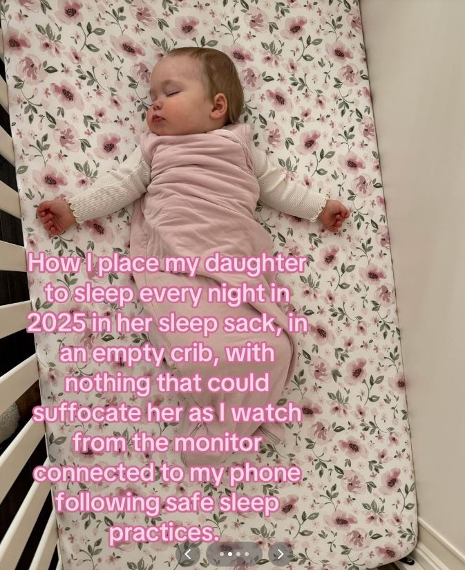 Η φωτογραφία της κόρης της Clark από το 2025 είναι εντυπωσιακά διαφορετική. Η κούνια είναι εντελώς άδεια! Το μωρό κοιμάται ανάσκελα πάνω σε ένα στρώμα με εφαρμοστό σεντόνι και φοράει ένα ύπνοσακο που συγκρατεί τα πόδια της. Τίποτα άλλο. Ούτε προστατευτικά, ούτε παιχνίδια, ούτε μαξιλάρια, ούτε κουβέρτες – σύμφωνα με τις πιο πρόσφατες παιδιατρικές οδηγίες.