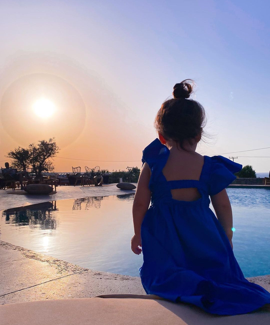 Η μικρή Σοφία με ένα μπλε φορεμα ποζάρει μπροστά από το ηλιοβασίλεμα.