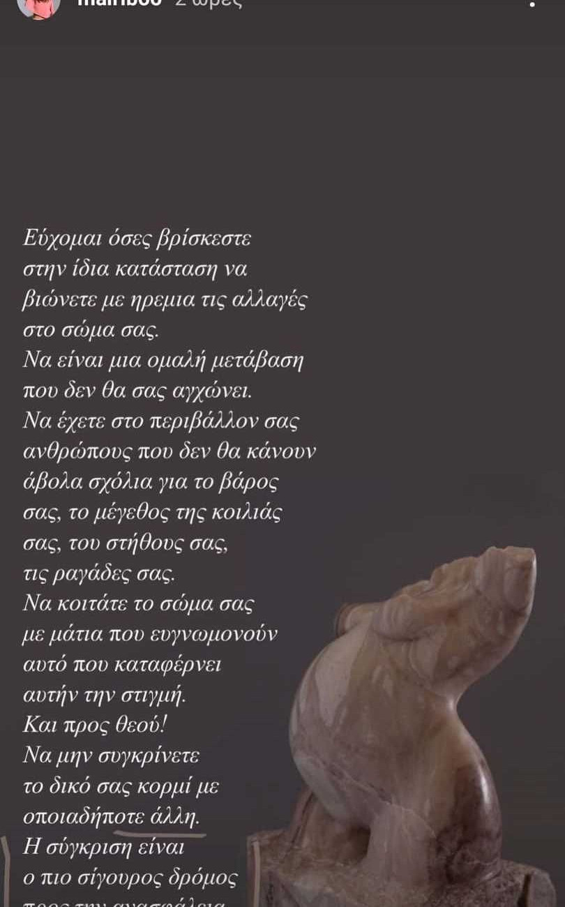 "Εύχομαι όσες βρίσκεστε στην ίδια κατάσταση να βιώνετε με ηρεμία τις αλλαγές στο σώμα σας", σχολίασε αρχικά και συνέχισε. "Να είναι ομαλή μετάβαση που δεν θα σας αγχώνει. Να έχετε στο περιβάλλον σας ανθρώπους που δεν θα κάνουν άβολα σχόλια για το βάρος σας, το μέγεθος της κοιλιάς σας, του στήθους σας, τις ραγάδες σας.