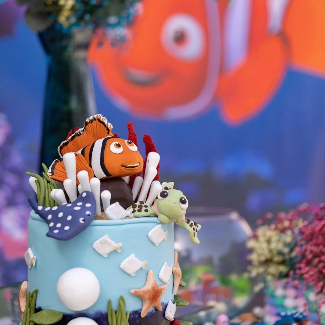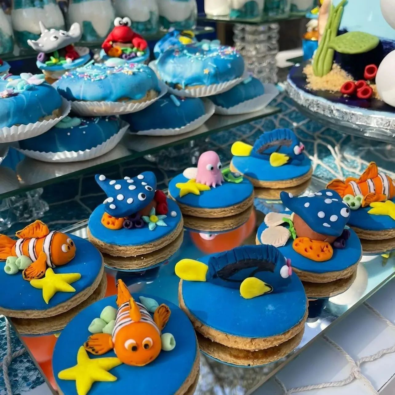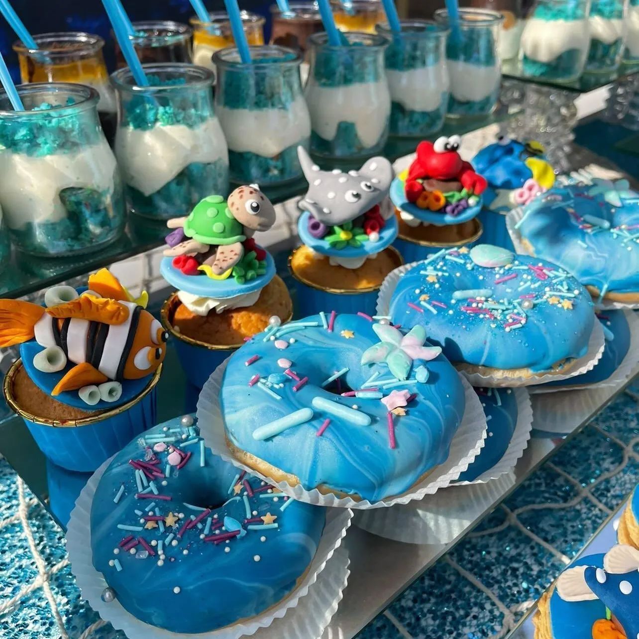 Όπως βλέπετε ο μπουφές για να τιμήσουν τον γιο τους τα είχε όλα: εντυπωσιακή τούρτα, ντόνατς, cupcakes με τους χαρακτήρες από την ταινία Nemo, μπισκότα, ροφήματα, cakepops και άλλα πολλά.