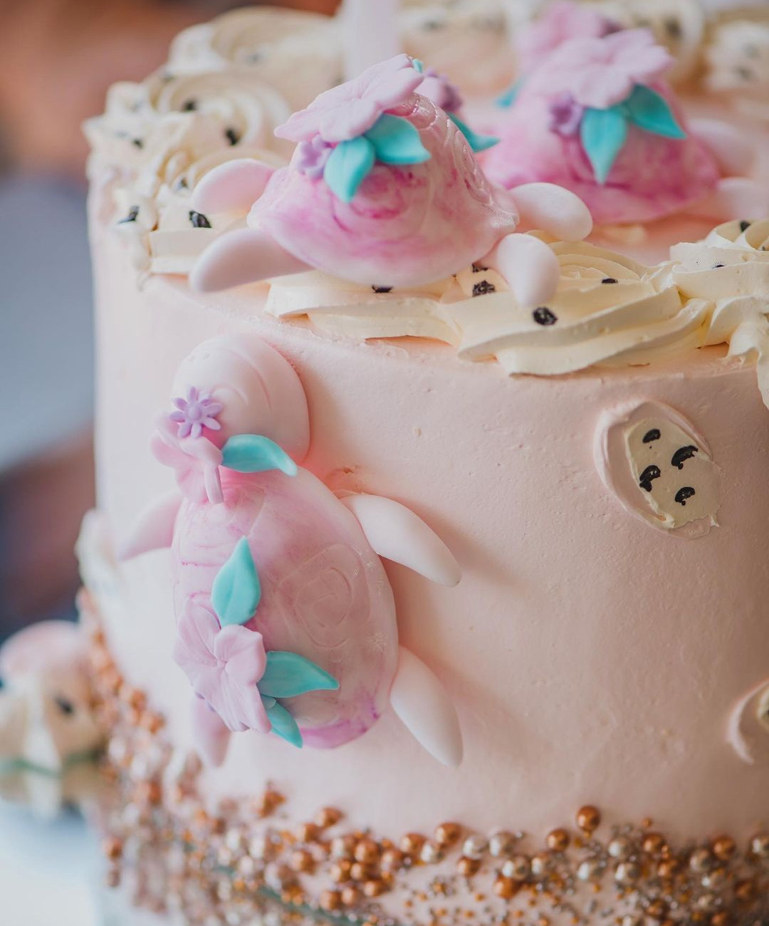 Η τούρτα είχε και αυτή χελώνες και ήταν σε παστέλ ροζ αποχρώσεις.