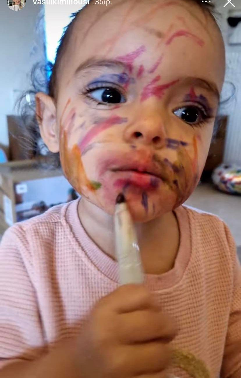 Τι μπορεί να γίνει όμως αν αφήσεις ένα παιδί μόνο του με μαρκαδόρους, χρώματα και μπογιές; Να πειραματιστεί και σε άλλες επιφάνειες εκτός από το χαρτί ή το μπλοκ ζωγραφικής. Το ίδιο έκανε και η Λένια, η οποία δεν γέμισε (ευτυχώς) τους τοίχους με τα χρώματα που κρατούσε στα χέρια της, αλλά επικεντρώθηκε στο πρόσωπό της.