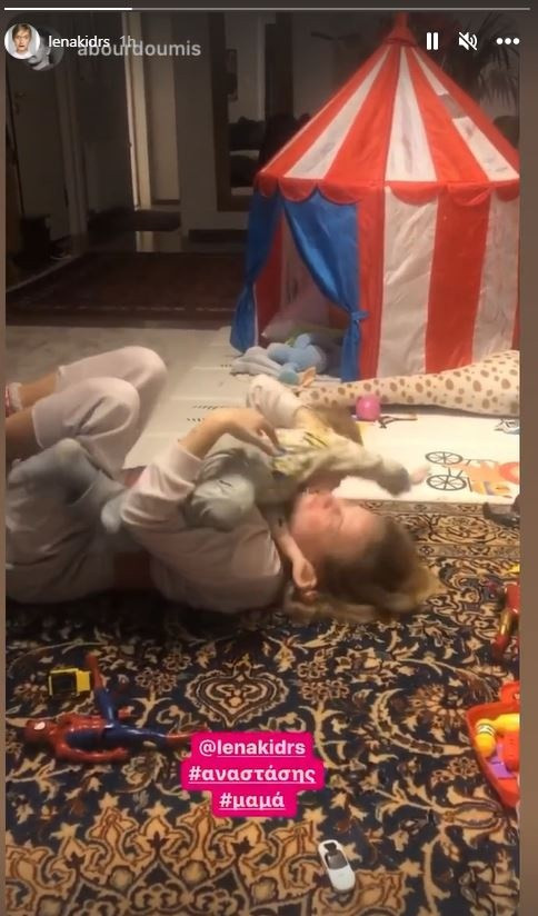 H Λένα Δροσάκη είναι στο καθιστικό και παίζει μαζί του. Κυλιούνται στο πάτωμα ανταλλάσσοντας φιλιά και αγκαλιές ενώ ο αγαπημένος τους μπαμπάς τους καταγράφει.