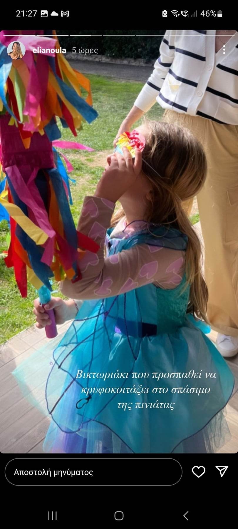 Βέβαια πάρτι έγιναν, συμμαθητές καλέστηκαν, φορέματα φορέθηκαν, πινιάτες έσπασαν και κεράκια σβήστηκαν, επάνω σε λαχταριστές τούρτες (...) που ξέρουν από μονόκερους και ξέρουν κι από Bluey (η καλύτερη παιδική σειρά κατά τη γνώμη μου, την παρακολουθούμε στην πλατφόρμα Disney+). Βλέπεις, πιστεύω πως, ως γονείς, έχουμε την υποχρέωση να γεμίζουμε την ζωή των παιδιών μας με χαρά, ό,τι κι αν συμβαίνει σε εμάς τους ίδιους σε προσωπικό, επαγγελματικό ή κοινωνικό επίπεδο. Γιατί, όπως λέει ο μπαμπάς της Bluey, «τα λουλούδια μπορεί να ξαναανθίσουν, αλλά ένας άνθρωπος δεν έχει την ευκαιρία να γίνει παιδί ποτέ ξανά», σχολίασε η δημοσιογράφος.