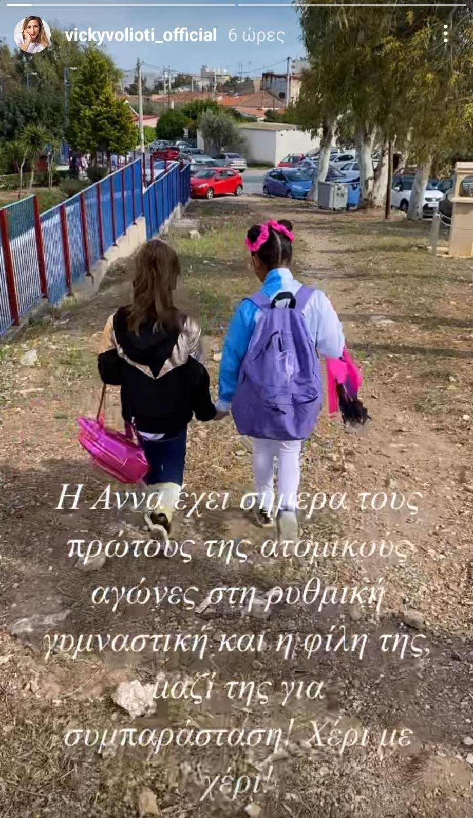 «Η Άννα έχει σήμερα τους πρώτους της ατομικούς αγώνες στη ρυθμική γυμναστική και η φίλη της, μαζί της για συμπαράσταση. Χέρι με χέρι!», έγραψε η ηθοποιός δείχνοντας τα δυο κορίτσια να περπατούν πιασμένες χέρι-χέρι.