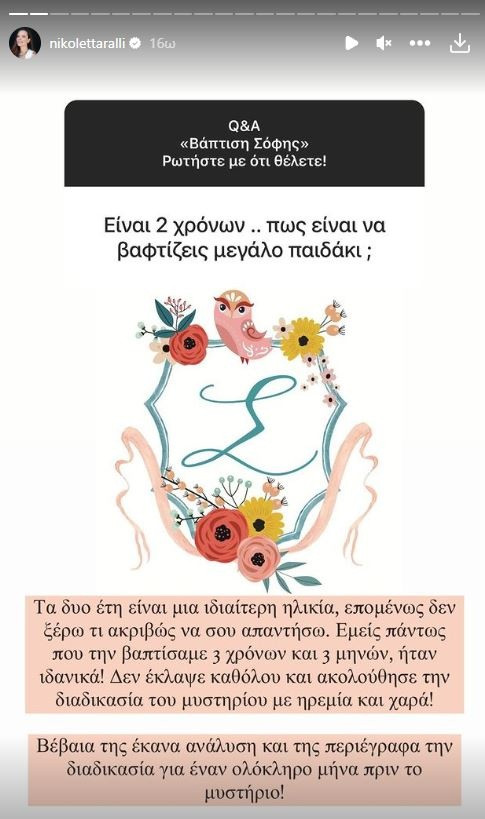 Μετά την ανάρτηση των πρώτων φωτογραφιών από τη βάφτιση της Σοφίας, η Νικολέττα Ράλλη έκανε ένα Q&A για να ρωτήσουν οι διαδικτυακοί της φίλοι όλα όσα ήθελαν για τη βάφτιση. Έτσι η παρουσιάστρια αποκάλυψε μερικές λεπτομέρειες που ήταν άγνωστες μέχρι σήμερα και απάντησε, γιατί ήταν ξυπόλητη κατά τη διάρκεια του μυστηρίου, τόσο εκείνη όσο και η κουμπάρα της.