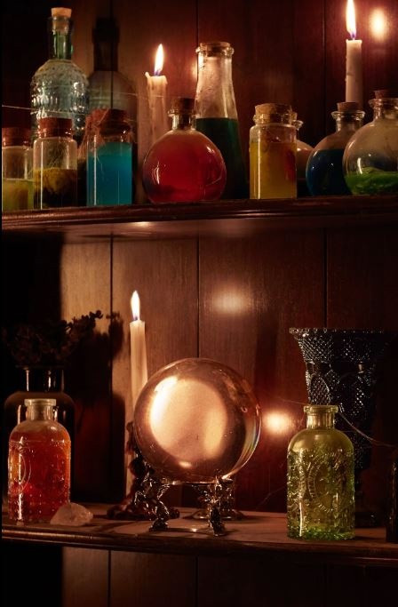 Από το σπίτι, όπως θα δείτε και στις φωτογραφίες που ακολουθούν, δεν λείπει τίποτε. Τα σκουπόξυλα, το καζάνι, το βιβλίο με τα ξόρκια, τα μπουκαλάκια με τα μαγικά φίλτρα, τα κεριά, ακόμη και η φλόγα από το μαύρο κερί, είναι εκεί.