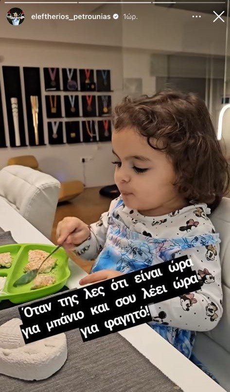 Πρόσφατα ο Ολυμπιονίκης αποκάλυψε στους folllowers του ποια είναι η αντίδραση της Λένιας όταν της λέει ότι είναι ώρα για μπάνιο. Όπως γράψει στην ανάρτησή του, εκείνη του λέει ότι είναι ώρα για φαγητό και μάλιστα ο Λευτέρης Πετρούνιας την απαθανάτισε να απολαμβάνει το γεύμα της.