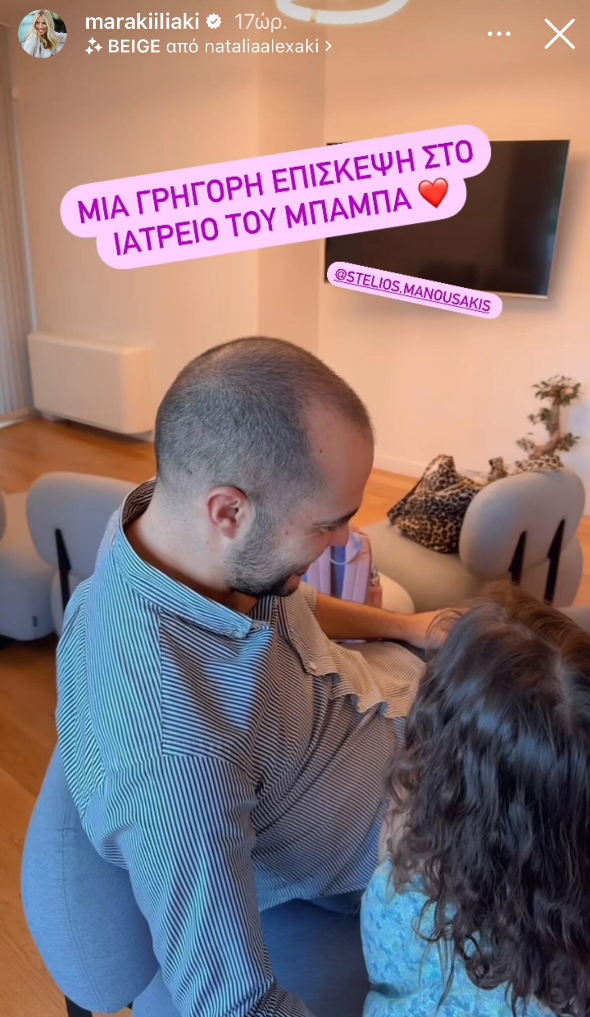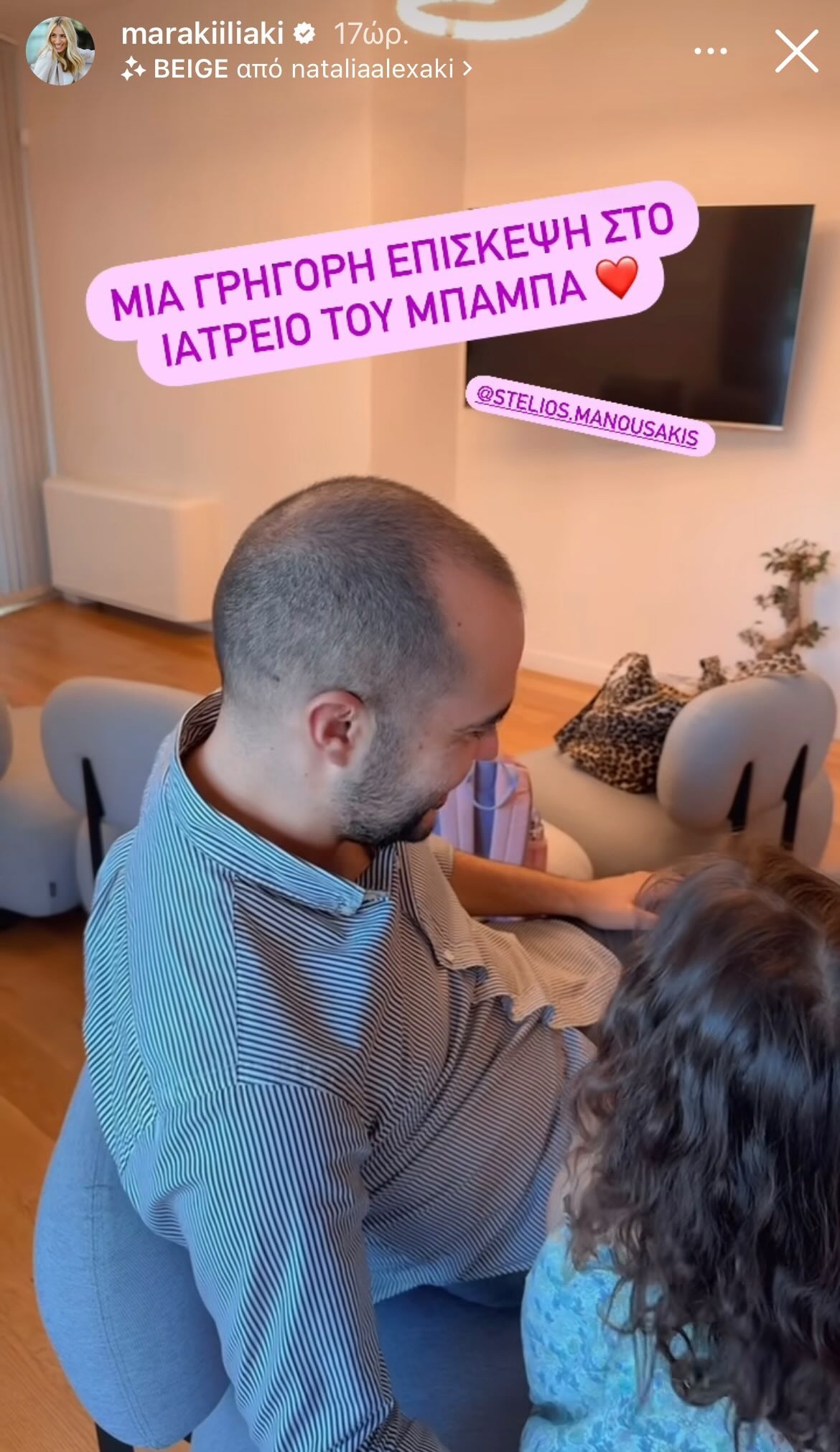Μαμά και κόρη είναι αχώριστες και εκτός σπιτιού και όπως φαίνεται κάνουν κάποιες απρόσμενες αλλά «γλυκές» επισκέψεις στο γραφείο του μπαμπά της Κατερίνας και συζύγου της Μαρίας Ηλιάκη, στον Στέλιο Μανουσάκη. Ο ίδιος είναι πολύ γνωστός γυναικολόγος.