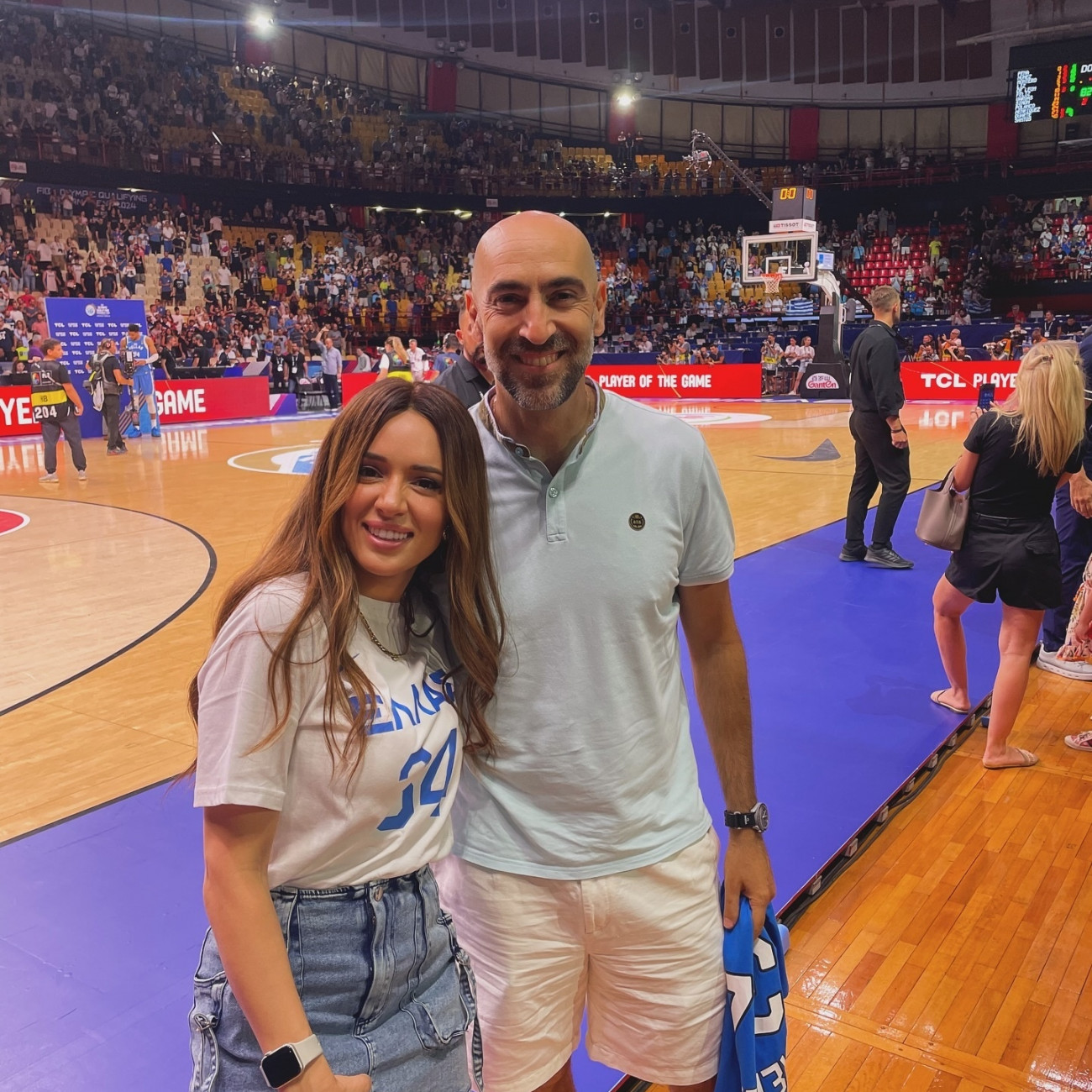 Οι πολύ καλές φίλες και κουμπάρες, φόρεσαν ίδια μπλουζάκια με τον αριθμό 34 και στήριξαν μαζί με τους συζύγους τους μερικούς από τους κορυφαίους παίχτες όπως τον Γιάννη Αντετοκούνμπο, τον Νικ Καλάθη και τον Ντίνο Μήτογλου ενώ με ένα πλατύ χαμόγελο πόζαραν όλοι μαζί δίπλα από τον θρύλο του ελληνικού μπάσκετ, Παναγιώτη Γιαννάκη.