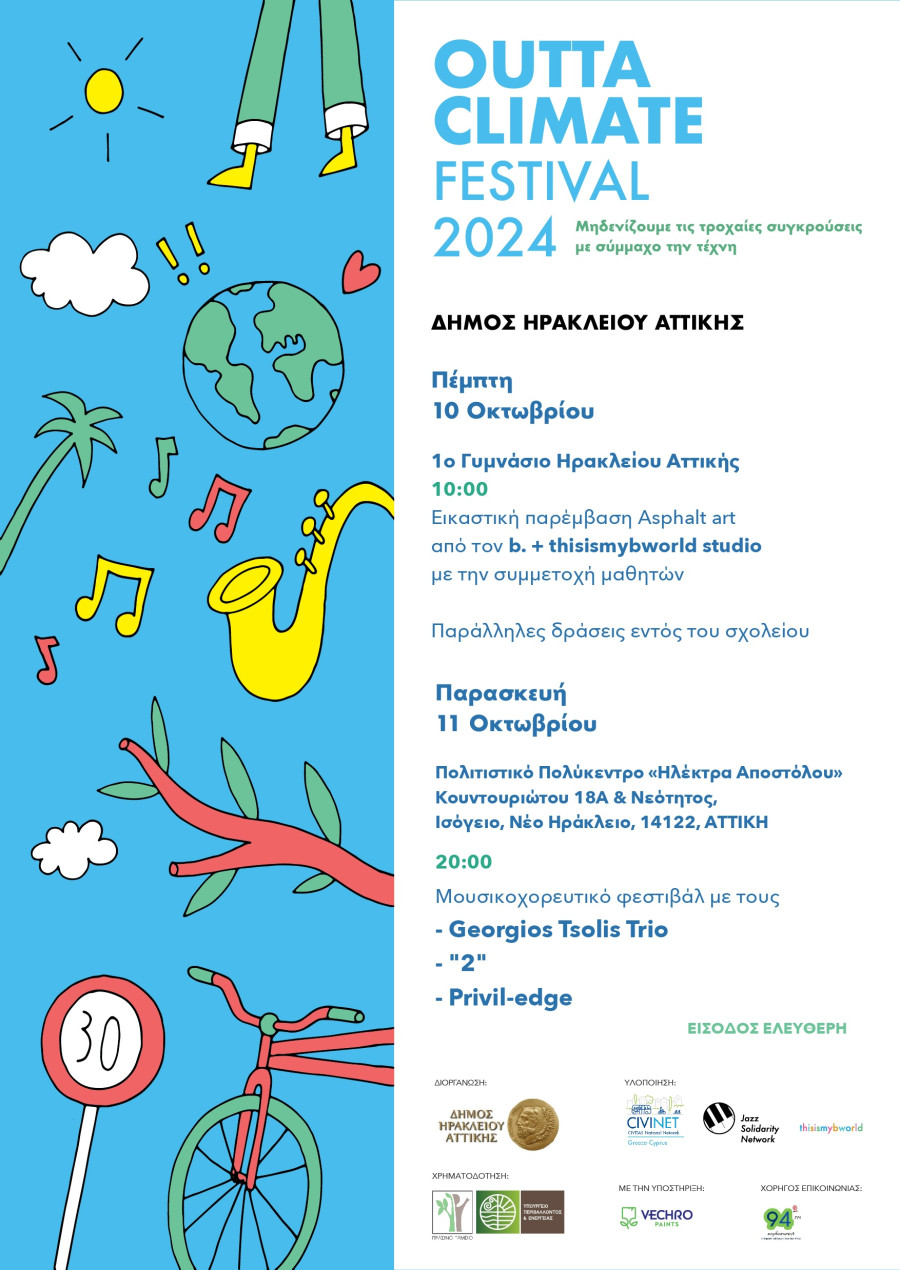 Με ένα διήμερο πρόγραμμα, σχεδιασμένο για μικρούς και μεγάλους, το Outta Climate Festival στον Δήμο Ηρακλείου Αττικής περιλαμβάνει πρωινές παρεμβάσεις “asphalt art” έξω από το 1o Γυμνάσιο, παράλληλες εκπαιδευτικές δράσεις εντός του σχολείου και μουσικοχορευτικό φεστιβάλ στο Πολιτιστικό Πολύκεντρο “Ηλέκτρα Αποστόλου”.