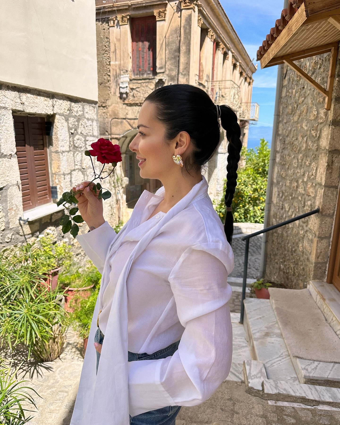 Η παρουσιάστρια περπάτησε στα σοκάκια του χωριού, με το ανθισμένο φόντο της άνοιξης να γεμίζει τις φωτογραφίες με χρώματα και φυσικά αρώματα. Μας έδειξε με περηφάνια τα τοπία, τα βουνά και τον καθαρό ουρανό, αποπνέοντας μια αίσθηση ελευθερίας και επανασύνδεσης με τη φύση.