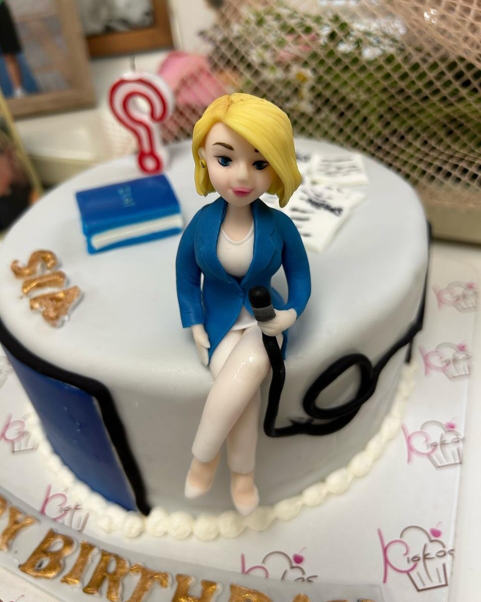 Όπως θα δείτε, η τούρτα ήταν διακοσμημένη με ομοίωμά της κι ένα κεράκι – ερωτηματικό.