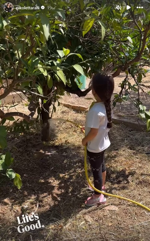 Στις φωτογραφίες που ανάρτησε, βλέπουμε τη μικρή της να ποτίζει τα δέντρα και τα λουλούδια του κήπου με ενθουσιασμό, φορώντας τα αθλητικά της και γεμάτη περιέργεια για κάθε γωνιά του χωραφιού.