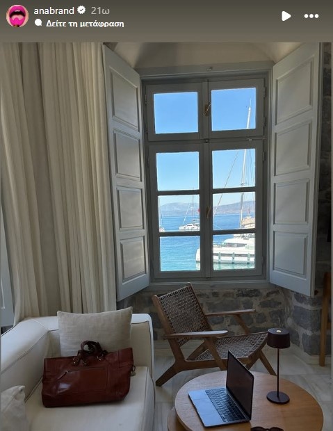 Φτάνοντας στην Ύδρα, η Ανίτα μάς ξεναγεί μέσα από τα stories της στο όμορφο ξενοδοχείο όπου διαμένουν. Ένα πέτρινο, παραδοσιακό κατάλυμα, με μεγάλους φωτεινούς χώρους και θέα που κόβει την ανάσα – από το παράθυρο φαίνονται ιστιοπλοϊκά να αράζουν γαλήνια στο λιμάνι, δημιουργώντας μια αίσθηση ηρεμίας και ξεκούρασης. Στο δωμάτιο, βλέπουμε την ίδια να έχει δεμένο το μωρό στον μάρσιπο, κάτι που δείχνει όχι μόνο την φροντίδα των παιδιών της, αλλά και πόσο εξοικειωμένη είναι στο να κινείται άνετα μαζί τους, ακόμα και στις διακοπές.