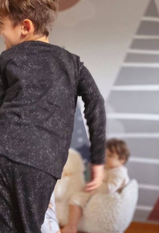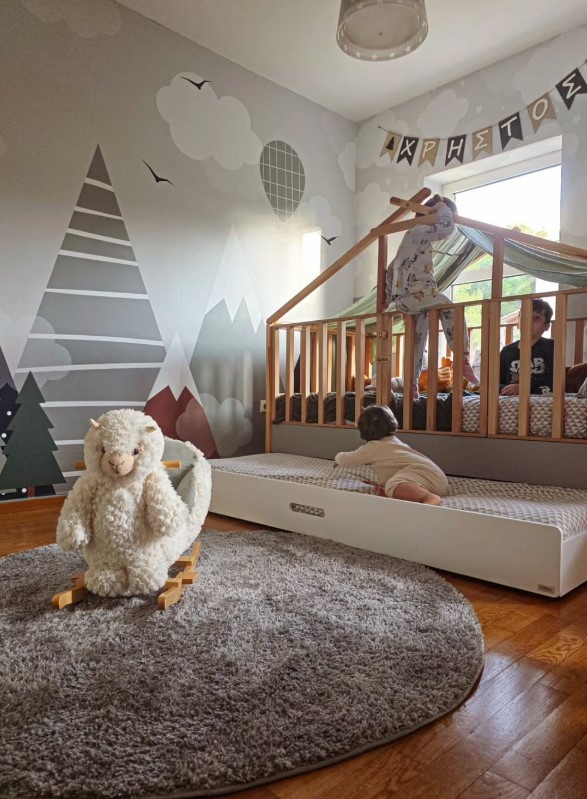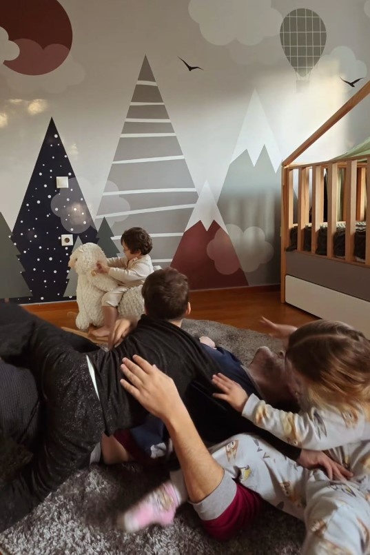 Στο post που μοιράστηκε πρόσφατα, βλέπουμε τα τρία παιδιά να παίζουν στο δωμάτιο του Χρήστου, έναν χώρο που μοιάζει βγαλμένος από παραμύθι. Οι τοίχοι είναι διακοσμημένοι με βουνά, σύννεφα, μπαλόνια και απαλά χρώματα που δημιουργούν μια ονειρική ατμόσφαιρα. Τα ξύλινα κρεβάτια, τα στρογγυλά χαλιά και τα λούτρινα παιχνίδια δίνουν μια ζεστασιά που κάνει τον χώρο ιδανικό για παιχνίδι, εξερεύνηση και στιγμές γλυκιάς ανεμελιάς.