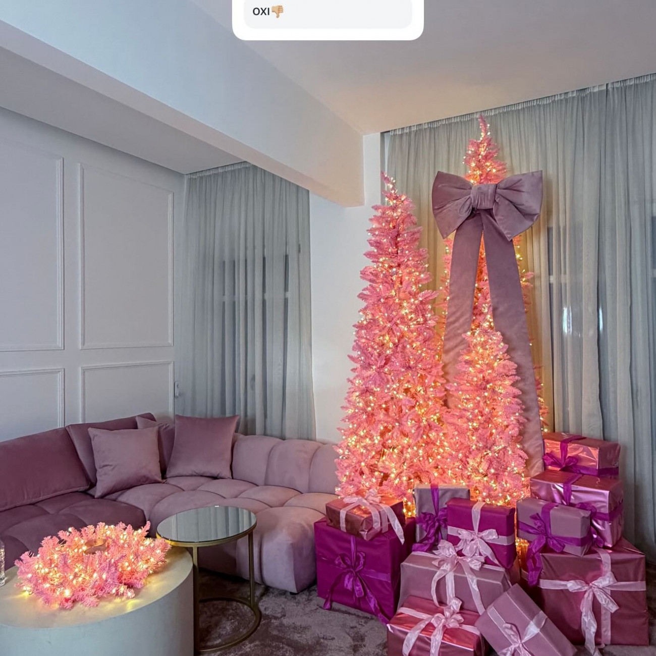 Όπως κάθε χρόνο, έτσι και φέτος, εμπιστεύτηκε το γούστο του Στέφανου, όμως φρόντισε να δώσει και η ίδια το προσωπικό της στιλιστικό touch, μένοντας πιστή στο αγαπημένο της χρώμα: το ροζ. Τα δέντρα, χωρίς κλασικά στολίδια, στολίστηκαν αποκλειστικά με φωτάκια, ενώ στο ένα από αυτά προστέθηκε ένας εντυπωσιακός μεγάλος ροζ φιόγκος. Το αποτέλεσμα ήταν ένα απόλυτα aesthetic χριστουγεννιάτικο, minimal αλλά πολύ εντυπωσιακό.