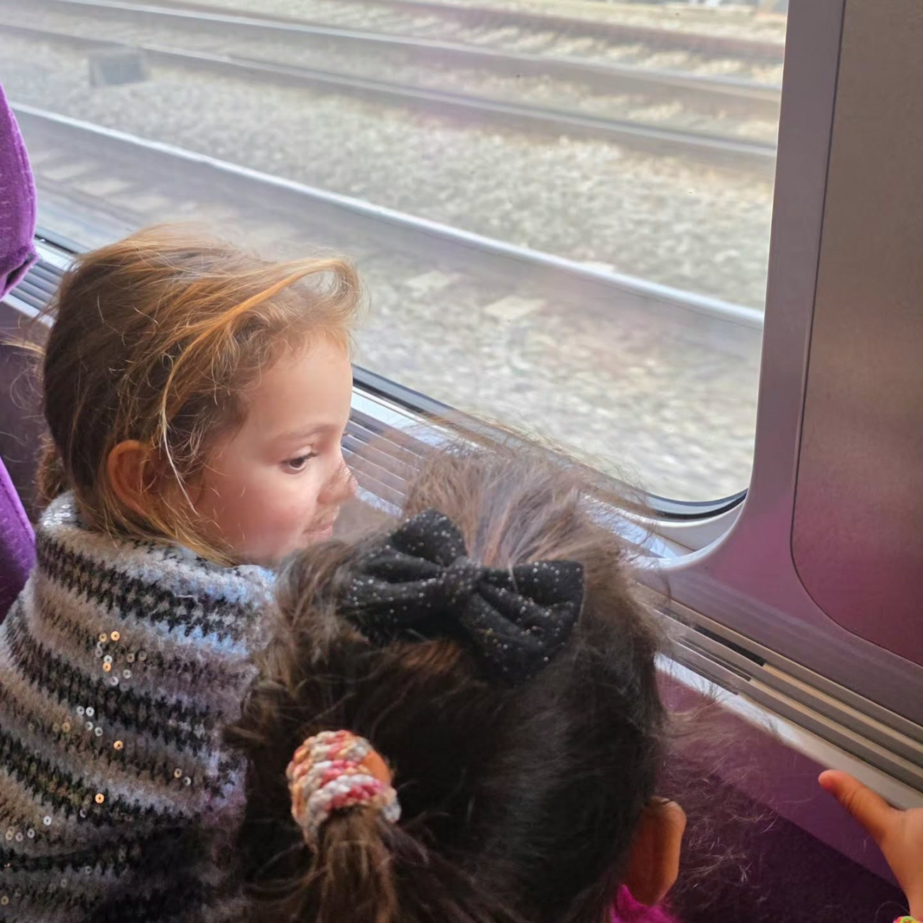 Οι πρώτες φωτογραφίες που μοιράστηκαν είναι από τις πρώτες ώρες του ταξιδιού τους και αποτυπώνουν μια ιδιαίτερα τρυφερή στιγμή. Η Σοφία και η Λένια έχουν κολλημένα τα προσωπάκια τους στο παράθυρο του τρένου, παρακολουθώντας με ενθουσιασμό τη διαδρομή. Μια εικόνα που θυμίζει κάτι από το «Πολικό Εξπρές» και μεταφέρει τη μαγεία που βιώνουν τα παιδιά όταν ανακαλύπτουν τον κόσμο μέσα από ένα ταξίδι.