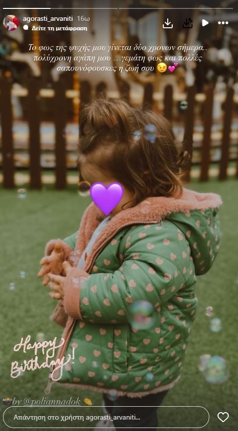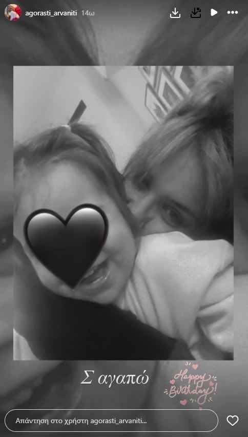 «Το φως της ψυχής μου γίνεται δύο χρονών σήμερα… Πολύχρονη αγάπη μου… γεμάτη φως και πολλές σαπουνόφουσκες η ζωή σου». Λίγο αργότερα, ακολούθησε ένα δεύτερο story, μια ασπρόμαυρη selfie μαμάς και κόρης.