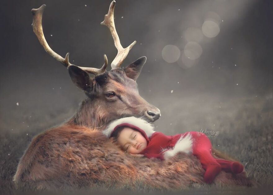 Μωράκι κοιμάται στην αγκαλιά ενός ελαφιού.
