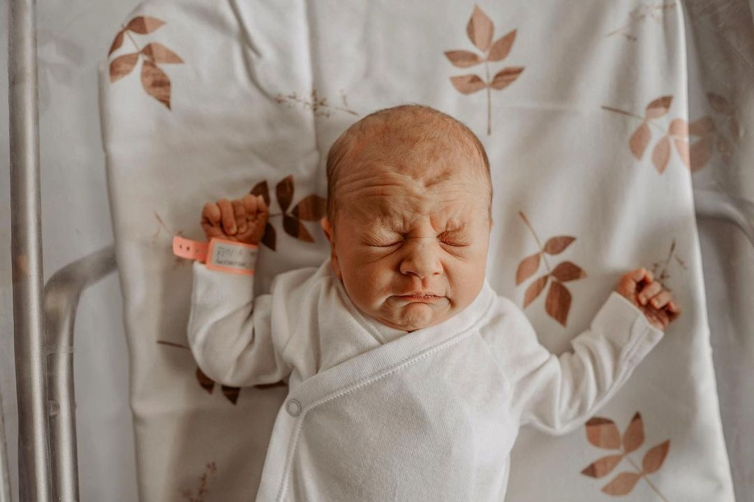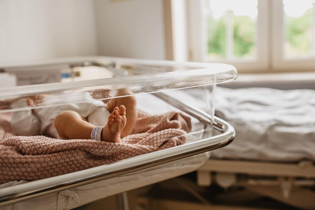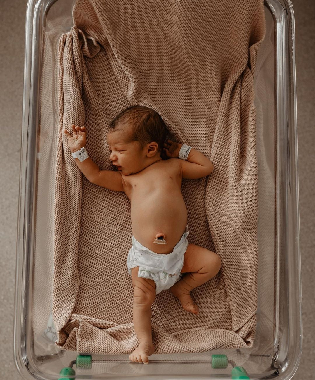 Νεογέννητο στο κρεβάτι του μαιευτηρίου.