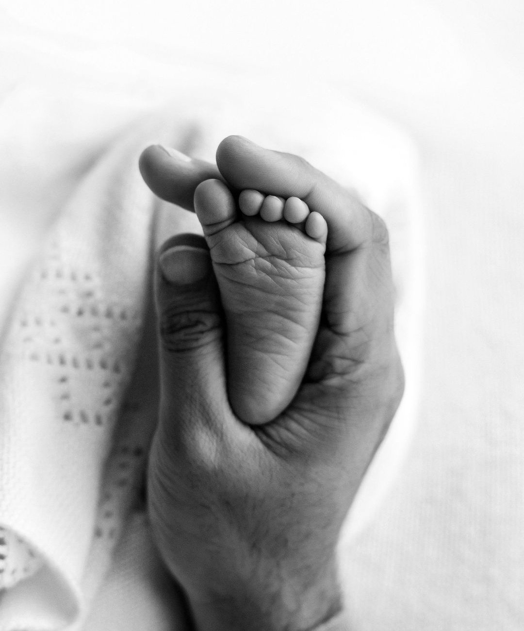 Μπαμπάς κρατάει στο χέρι του το μικροσκοπικό πατουσάκι του νεογέννητου μωρού του.