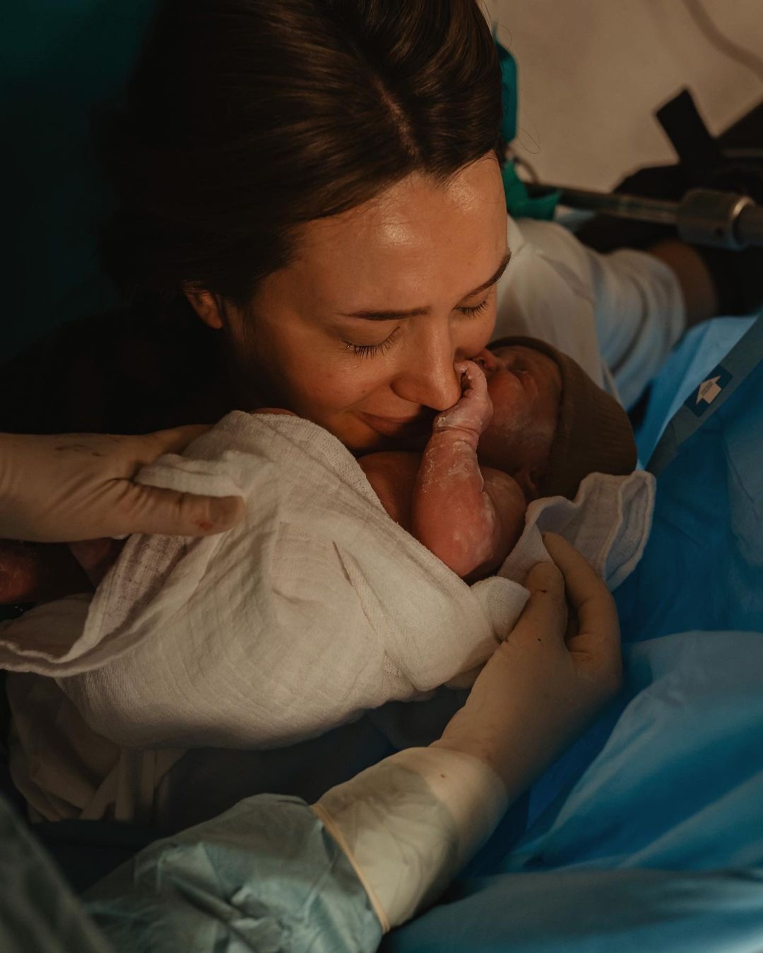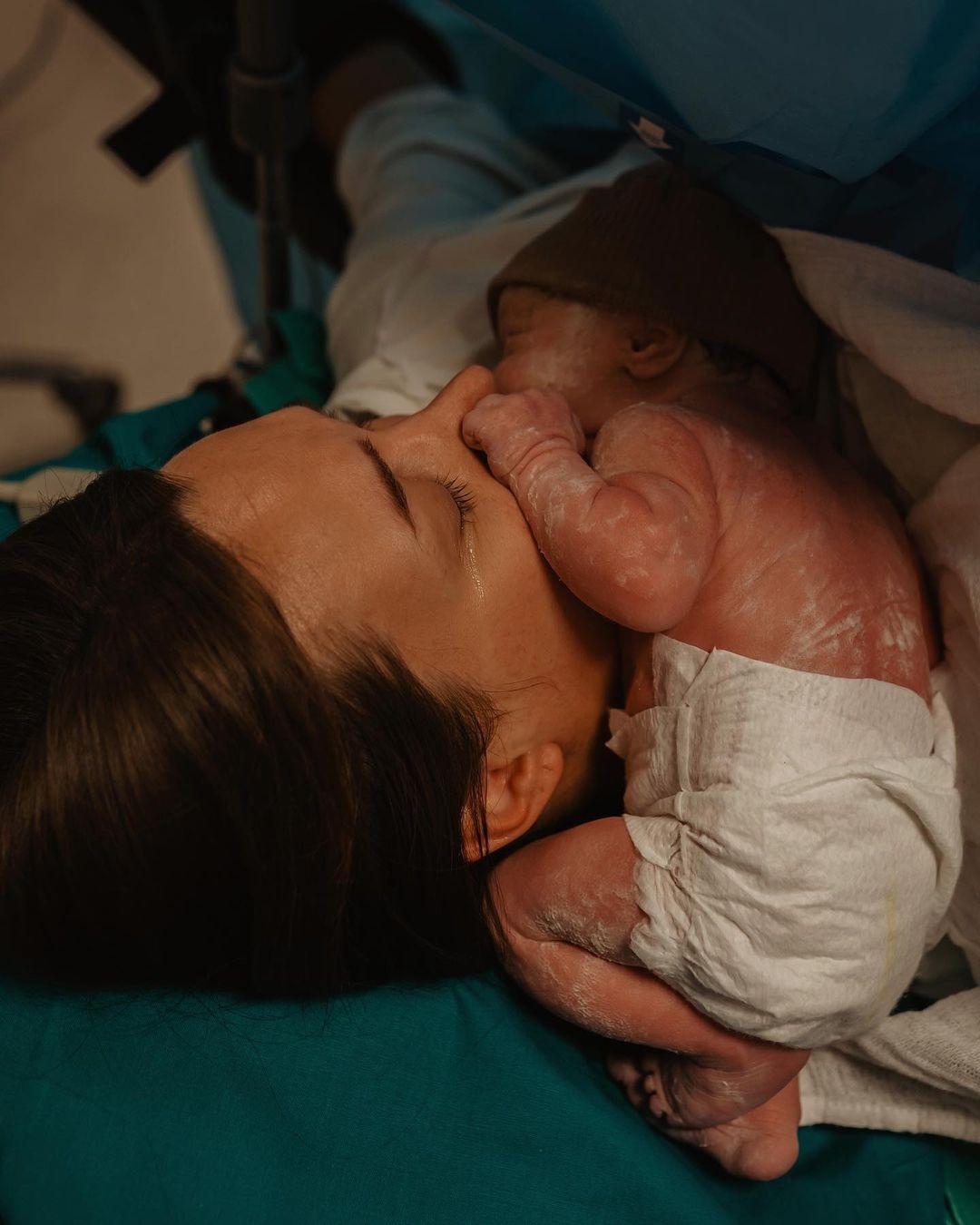 Στις φωτογραφίες μία μαμά κρατά για πρώτη φορά το μωρό της αγκαλιά και κλαίει από συγκίνηση.