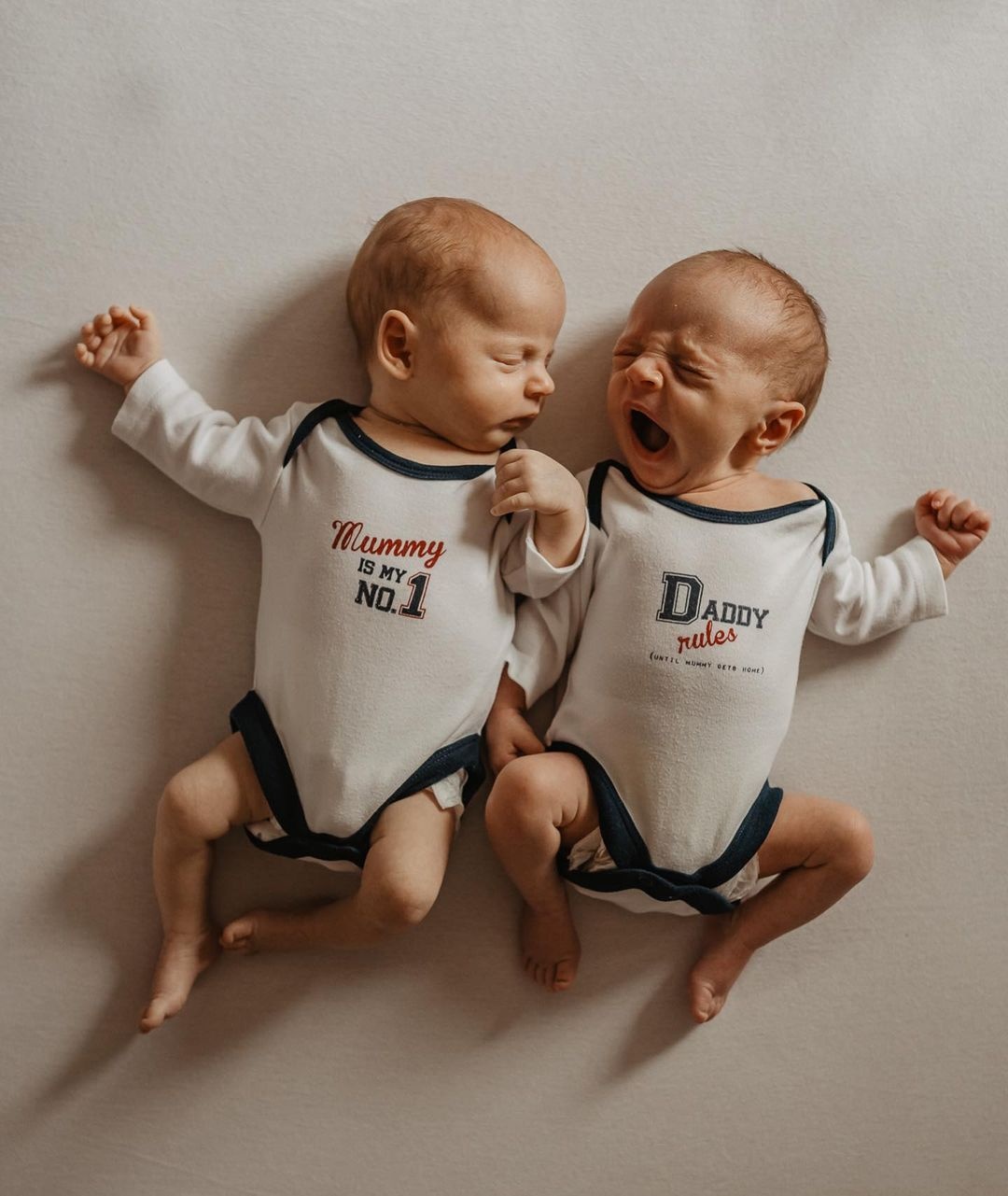 Δίδυμα νεογέννητα με ασορτί ντύσιμο.