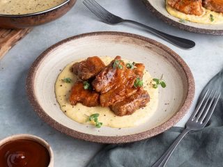 Μοσχαρίσιες στηθοπλευρές με κόκκινο κρασί και πουρέ γλυκοπατάτας