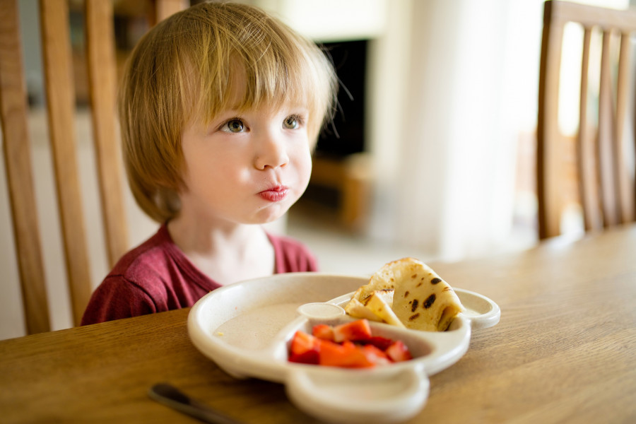 Νήπιο τρώει κρέπα με φράουλες.