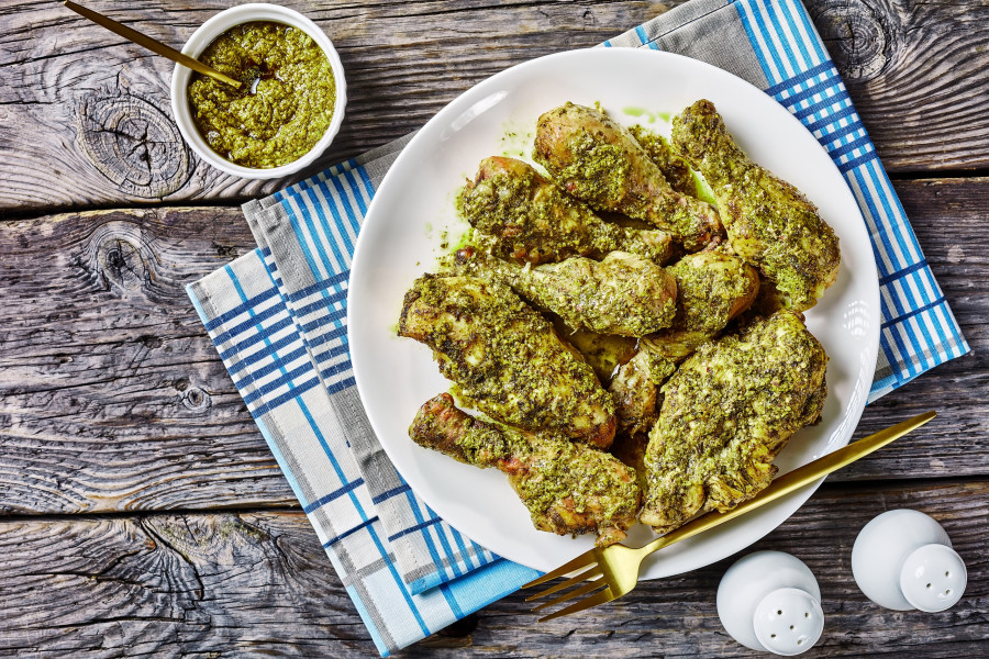 Φιλέτα κοτόπουλου, πέστο βασιλικού, ντοματίνια, τριμμένο τυρί, ελαιόλαδο.