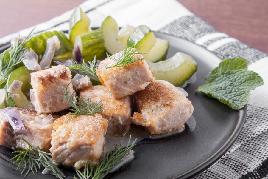 Κόβετε τον σολομό σε κύβους και ψήνετε στο air fryer μέχρι να γίνουν τραγανοί εξωτερικά.