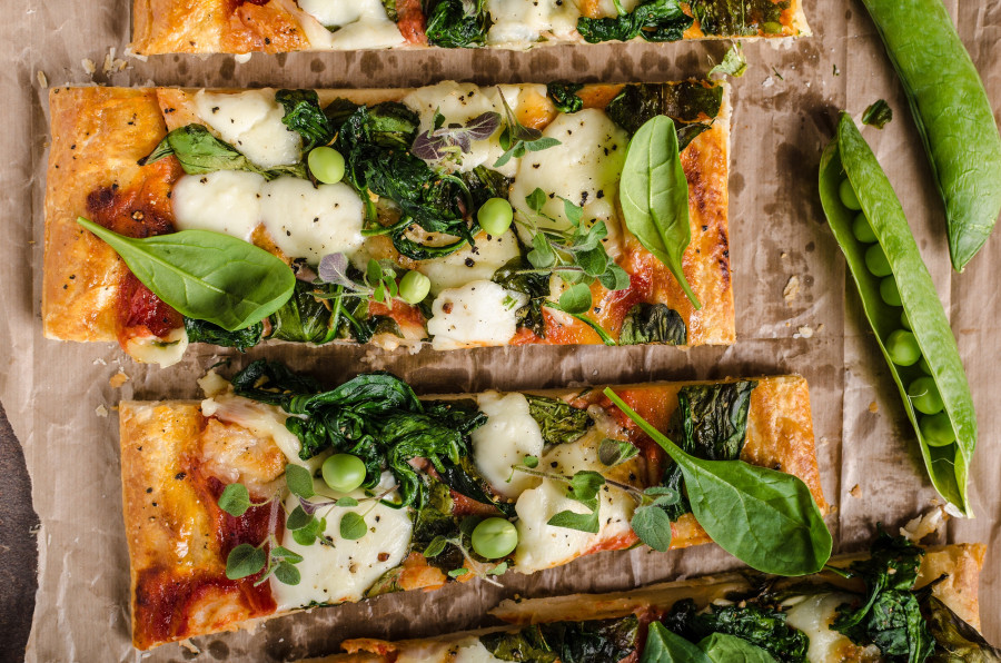 Ζύμη πίτσας, κοτόπουλο, σπανάκι, τριμμένη μοτσαρέλα, σάλτσα για πίτσα.