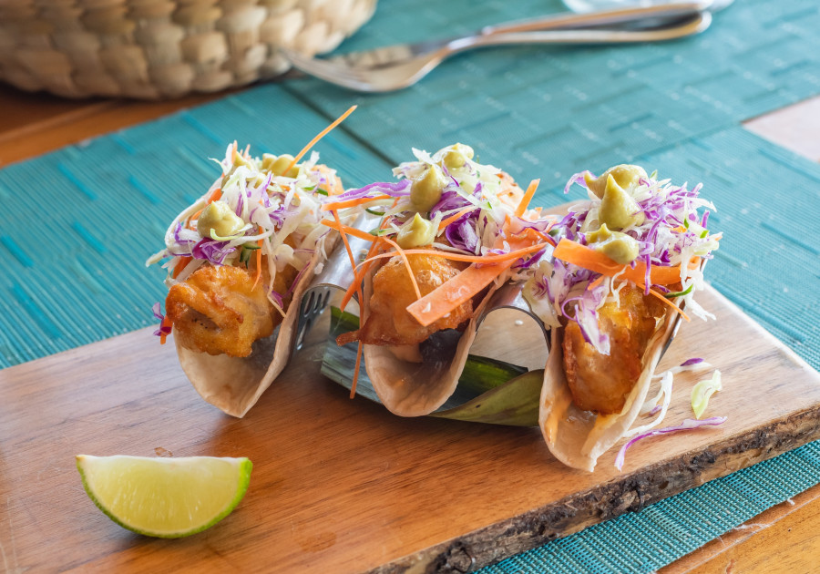 Λευκό ψάρι, καρυκεύματα, tortillas, λαχανικά.