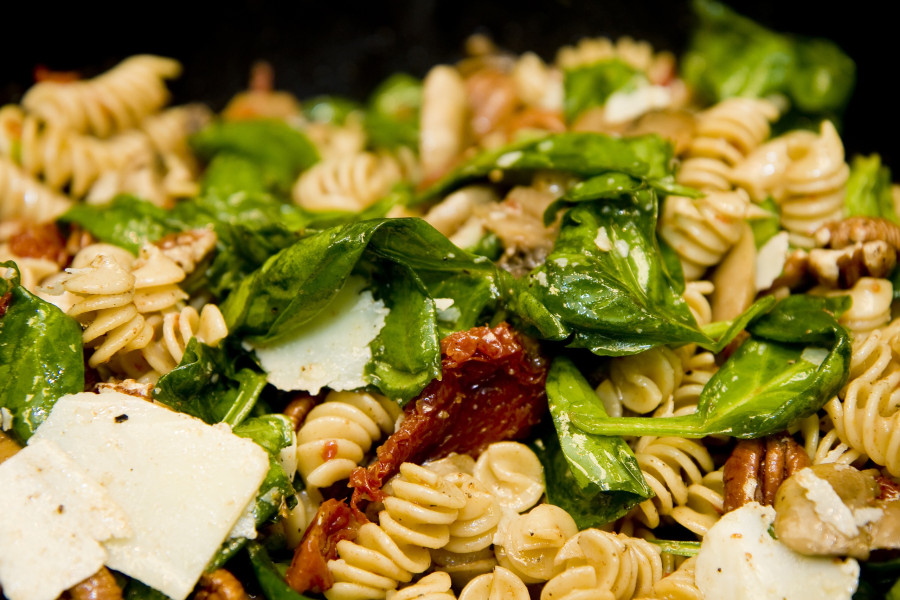Ζυμαρικά, λιαστές ντομάτες, kale, φέτα, ελαιόλαδο.
